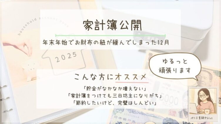 家計と節約のあれこれメモ 【家計簿公開】2025年12月|ボーナス月なのにお金が残らなかった 浪費家だった私が家計管理を始めて半年。2025年12月の収入・支出・ボーナスの使い道・NISA積立まで正直に公開します。家計簿初心者さんやズボラさんにも参考になるリアルな家計管理記録です。 2026.01.10 家計と節約のあれこれメモ