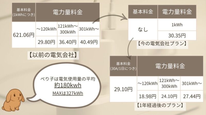 乗り換え前の会社で一番使っていた時期の1kWhと乗り換え後の1kWhを比べると比べると大分安くなるみたいだったので、1年後切り替わったとしても大丈夫かな~と思っています(‘ω’)